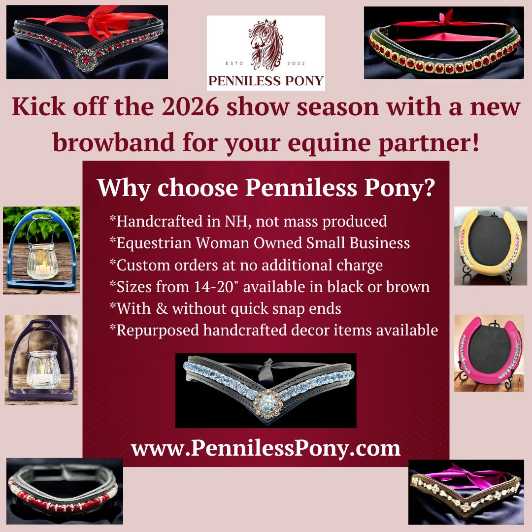 I own a small horse farm in Rochester, NH with my husband and our Percherons & Percheron crosses. I started Penniless Pony because I was having a difficult time finding pretty, well made browbands for my horses that were reasonably priced.