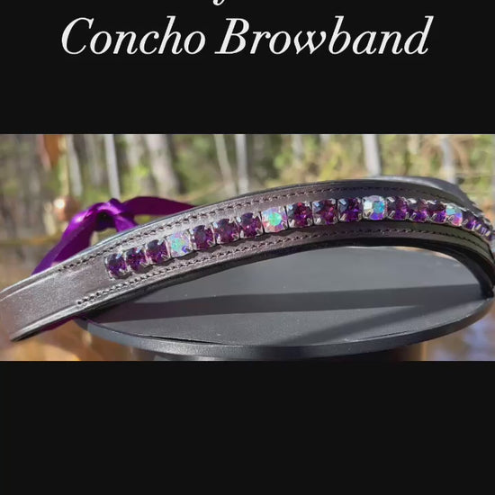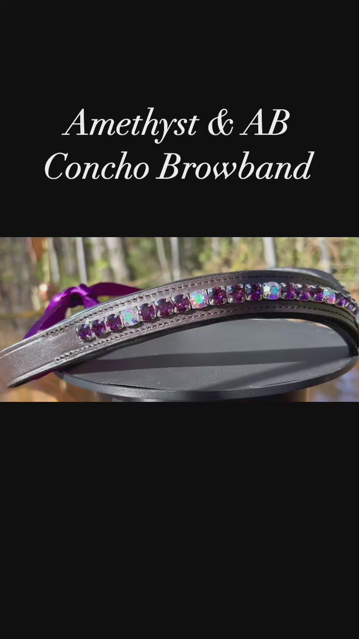 Wow!! Amethyst & AB Rhinestone Concho browband 17” dark brown padded leather with standard end loops. Bedazzled with a gorgeous amethyst & AB clear rhinestone concho & flanked by matching handset Preciosa rhinestones that are hand sewn in place.